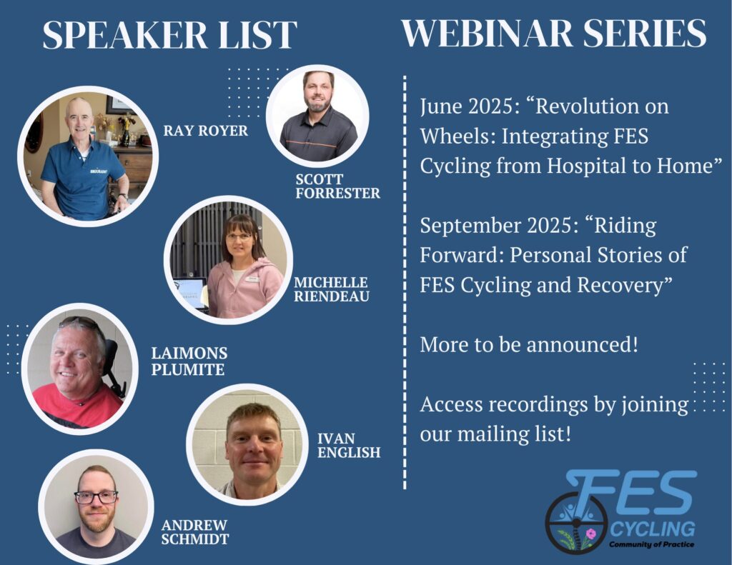 We aim to bring together a network of individuals to advance functional electrical stimulation (FES) cycling for spinal cord injury (SCI) rehabilitation, exercise, and sport as part of an interprovincial Community of Practice (CoP). This CoP will initially include people from Alberta or Saskatchewan. However, we will host national and international speakers. This group represents the first step towards development of a national FES cycling CoP.